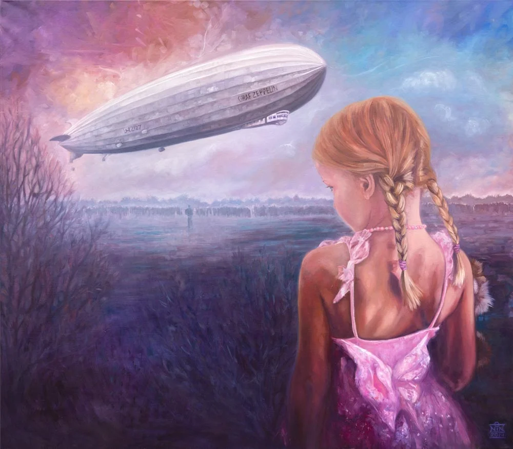 My daughter has been the model for this painting. I have tried to capture the vulnerability when the expectations of the people we surround ourselves with do not match reality. Life is a dangerous journey. A bit like traveling with a Zeppeliner. These airships had a brief career since they had an unfortunate tendency to explode, but this one - Graf zeppelin is considered one of the most successful in the history of the airships. In 1929, Graf Zeppelin flew around the world in 20 days, 4 hours and 14 minutes.